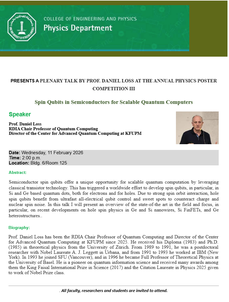 PRESENTS A PLENARY TALK BY PROF. DANIEL LOSS AT THE ANNUAL PHYSICS POSTER COMPETITION III